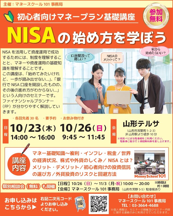 【会場】マネースクール101事務局(山形市芳野5-5 駐車場有)