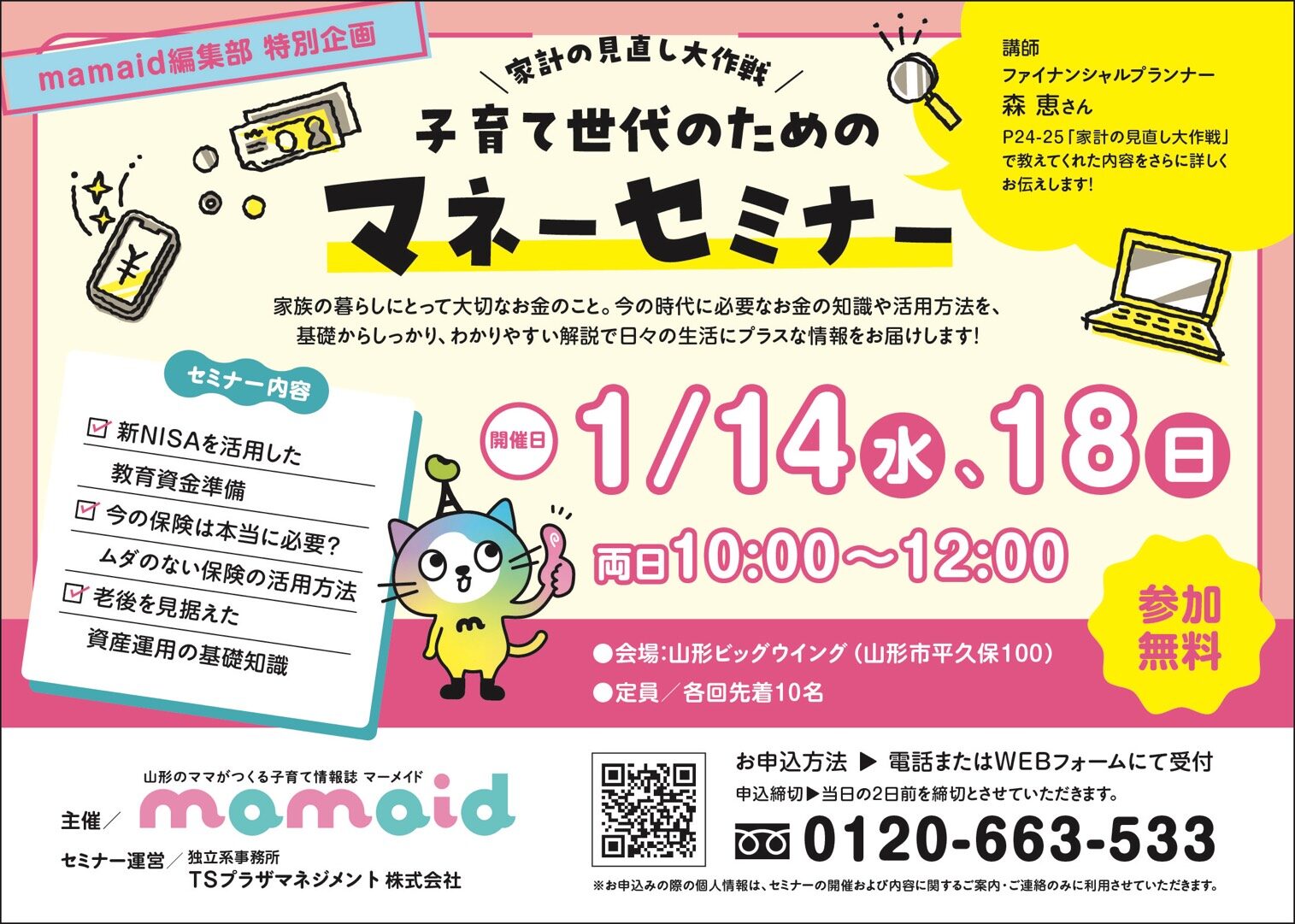 1月14日(水)開催【参加無料】mamaid様主催 家計の見直し大作戦!子育て世代のためのマネーセミナー